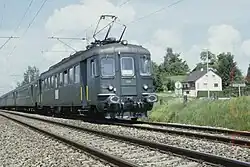 Starting in 1959, the SBB motor coach of the type RBe 4/4 (current designation RBe 540) was introduced as a replacement for the old SBB electric locomotives Ae 3/5, Ae 3/6 I, Ae 3/6 II and Ae 3/6 III with three driving axles. As a consequence, they had much power at their disposal, even more than the Re 4/4 I locomotives, a regenerative brake, cabs on both ends with doors to passenger carriages as well as multiple unit (SBB Vst IIId type) or driving trailer control. The original motor coaches had 64 seats, 32 smoking and 32 non-smoking, and were painted in ordinary SBB green.