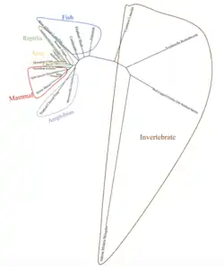 Over 100 orthologs exist for the human gene SCRN3.[23] The known orthologs were found to exist in vertebrates and invertebrates, but not in plants, bacteria, or fungi. The divergence date of 20 orthologs found were compared relative to Homo sapiens. Invertebrates are the most distantly related orthologs to human SCRN3, with the furthest median date of divergence from this set of orthologs being 694 million years ago.