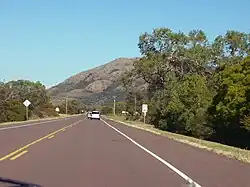 State Highway 44 begins at an intersection with the Great Plains Trail of Oklahoma in the Quartz Mountains, just northwest of Byrd Mountain in Greer County.[3] From the terminus, SH-44 heads northeast, crossing the North Fork of the Red River into Kiowa County. Just after crossing the river, the highway spawns its only spur route, SH-44A. The road continues through the Quartz Mountains, passing in between Williams Peak and King Mountain. The route then follows the south shore of Lake Altus-Lugert, passing between the lakeshore and Mount Lugert.[3] As SH-44 leaves the mountains, it passes through the unincorporated place of Lugert, from which both the lake and the mountain get their name. The highway then heads north-northwest until it reaches SH-9 on the east side of Lone Wolf. It follows SH-9 to the east before splitting off along a due north course. The highway curves northeast to cross Elm Creek, the turns back to the north just after crossing into Washita County.[3]