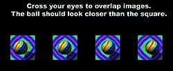 - ^ a b If a two-image stereogram, wallpaper, or random-dot autostereogram designed for wall-eyed viewing is viewed cross-eyed, or vice versa, all details on the z-axis will be reversed – objects that were meant to be seen to rise above the background will appear to sink into it. However, there may be some incoherence due to overlapping (an object originally intended to project in front of another object will now project behind it). For example, the black lines in File:Stereogram Tut Simple.png.