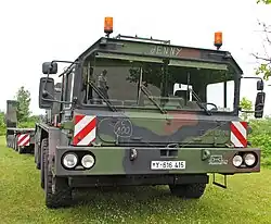 The heavy transporter Franziska belongs to the Bundeswehr's 3rd generation of vehicles and extends the ability to carry extra heavy tanks. While the STL56 is externally similar to the SLT 50, it is in fact an independently and completely new developed vehicle. The best way to tell the SLT56 apart from the Elefant is by the tandem lights the SLT56 carries in the front bumper, while the Elefant only has single lights. Technically, they differ in the drive train and the engine. The trailer is also different, as is the configuration of the winches and boxes. Similar to the Elefant, the SLT56 is equipped with two Rotzler winches for pulling tanks or other disabled vehicles onto the trailer. The trailer's platform measures 8.9m by 3.15m, the weight is distributed on 24 wheels, two per short axle, six of those axles per side (the front two are steerable).