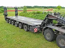 With the deployment of the new Leopard 2 variants A5 and A6 the trailer had to be modified again because of the increased weight. There is a reinforcement in the trailer neck, as well as new fenders in front of the shock absorbers and new spacers between the loading ramps. This last modification lets the ramps stand straight in the up position, making loading the long MAN 10t gl truck possible.