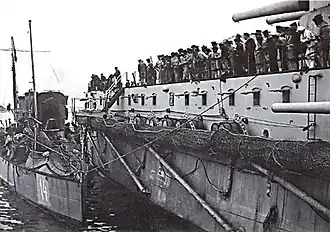 In 1910, on the basis of the ordinance on the normalization of names, Kígyó was renamed Torpedoboot 14. In 1913, she underwent a major renovation, and in 1914 she was adapted to act as a seaplane tender, one torpedo tube being removed to be replaced by a catapult.[3] Due to the collapse of the Habsburg monarchy on 1 November 1918, the KuK flag was hoisted on the vessel for the last time.[5] As a result of the Treaty of Trianon, the ship was awarded to Great Britain.[2][6] The vessel was scrapped in 1920.[3]