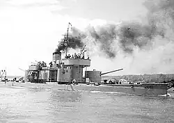 In early September 1941, Ardeal was damaged when a gunboat accidentally collided with her near Chilia. As a result, the monitor had to spend a few weeks for repairs at the Navy Arsenal.[11] After the 23 August 1944 coup, the monitors were ordered to relocate to Giurgiu and prevent German soldiers from crossing the river as well as capture or destroy any retreating German ships. Organized in the 3rd River Group at Hârșova and commanded by Lieutenant-Commander Eustațiu Nicolau with Basarabia as the leading ship, Ardeal together with Bucovina and Lahovary departed for Giurgiu on the night of 26/27 August. The group was divided in two, Ardeal with Lahovary and the torpedo boat Sborul were to act on the Borcea branch while the other two monitors were to act on the main course of the Danube. On 28 August, Ardeal and Lahovary captured 7 ships and 19 barges on the Borcea branch. A day later, the monitors were ordered to move to the border with Yugoslavia and proceeded with their march towards Turnu Măgurele. On 30 August, the Ardeal group, which was moving at a lower speed due to boiler problems, was instead ordered to the Călărași-Oltenița area to prevent the withdrawal of German soldiers from Bulgaria.[2][9][12][13]