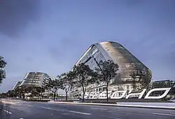 - Hongqiao SOHO, also known as Sky Soho, designed by Zaha Hadid and completed in 2014.[43] Due to its proximity to a nearby transportation hub, the building is designed to evoke high-speed rail cars.[43]