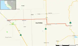 The route begins at State Route 99 in Kingsburg, Fresno County with an interchange. It then exits the county and enters Tulare County, where it meets County Route J31 and County Route J19. It then meets State Route 63 for a short concurrency. Upon leaving, it intersects County Route J15 and County Route J23 before meeting its east end at State Route 245 in Elderwood.