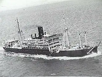 Barossa was in Darwin, Northern Territory on 19 February, when hundreds of Japanese aircraft attacked the port and town. Incendiary bombs hit her and set her on fire. Her crew, helped by tugs, tried unsuccessfully to fight the fire.[25][26] Accounts differ as to what happened next. News reports published in August 1945 say that she was listing heavily; but her crew beached her to stop her from sinking.[27][28] A report that the Royal Australian Navy (RAN) published in 1959, and republished in 1962, says she was towed into midstream, anchored, and left to burn herself out.[25][26] Her back was broken; her superstructures were burnt out; and some of her equipment was destroyed; but her engines and boilers survived undamaged. The Adelaide Steamship Company's senior engineer, Mr Arthur Rich, with a volunteer skeleton crew from Port Adelaide, surveyed the damage, and spent 12 months salvaging her with what remained of her own equipment. A tug came from Sydney with emergency equipment, but Barossa reached Sydney under her own power, accompanied by the tug.[27][28]