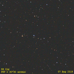 SS Cygni is a variable star in the northern constellation Cygnus (the Swan). It was discovered in 1896 by Louisa D. Wells, a computer working under Edward Pickering at Harvard College Observatory.[8][9] It is the prototype of the subclass of dwarf novae that show only normal eruptions. It typically rises from 12th magnitude to 8th magnitude for 1–2 days every 7 or 8 weeks. The northerly declination of SS Cygni (about 44° N) makes the star almost circumpolar from European and North American latitudes, allowing a large proportion of the world's amateur astronomers to monitor its behavior. Furthermore, since the star lies against the rich backdrop of the Milky Way band, the telescope field of view around SS Cygni contains an abundance of useful brightness comparison stars.