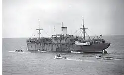 SS Empire Javelin served as a troop ship in Operation Overlord, starting with the initial landings on the beaches on 6 June 1944 ("D-Day").[1] She was lost on 28 December 1944 while in convoy to France with 1,483 troops aboard somewhere around the midpoint between Southampton, southern England, and Le Havre, France.[2] She may have been torpedoed by German submarine U-322, active in the area on the same day,[3] or struck a mine.[4]