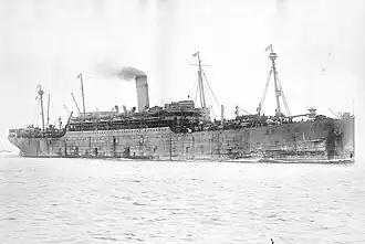 Manchuria was acquired by the Navy from the United States Shipping Board on 10 April 1918 and commissioned USS Manchuria (ID-1633) at New York on 25 April 1918 and assigned to the Cruiser and Transport Force.[32] Manchuria departed New York with a convoy on 30 April with the 18th Field Artillery and the 153d and 154th Infantry Battalions embarked for Europe arriving in Saint-Nazaire, France, on 13 May to debark her passengers.[32][33] Five days later she returned to the east coast, arriving at New York on 30 May.[32]