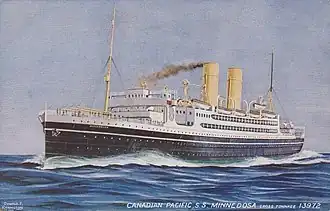 On 5 December 1918, Minnedosa began her maiden voyage from Liverpool to St John, New Brunswick, repatriating troops of the Canadian Expeditionary Force.[1] After trooping duties, Minnedosa began civilian service between Liverpool and Canada. From 1922 to 1927 her route was between Antwerp and St John[1] via Southampton.[8] In 1925 R&W Hawthorn, Leslie & Co refitted her in Hebburn,[1] which increased her tonnages to 15,186 GRT and 8,912 NRT.[9] For a period in the 1920s Minnedosa's Master was Captain Ronald Stuart, VC, which entitled her to fly the Blue Ensign.[10]