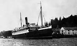 Princess Sophia was a steamship of 2,320 gross register tons (GRT) and 1,466 net register tons (NRT), built by Bow, McLachlan and Company at Paisley, Scotland, United Kingdom. A strong, durable vessel, she was built of steel with a double hull. Sophia was capable of handling more than just the Inside Passage, as her use on the stormy west coast of Vancouver Island demonstrated. She was equipped with wireless communications and full electric lighting.[1] While not as luxurious as her fleet-mates serving the Pacific Northwest, Sophia was comfortable throughout, particularly in first class. She had a forward observation lounge panelled in maple, a social hall with a piano for first-class passengers, and a 112-seat dining room with large windows for observing the coastal scenery.