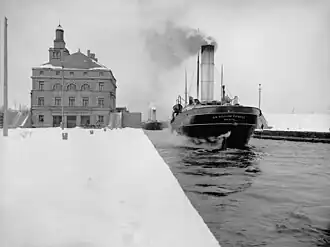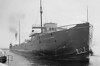 On a May 1897 trip between Duluth and Fairport, Ohio, Sir William Siemens broke the record for the largest cargo of iron ore shipped from a Lake Superior port at 5,387 long tons (5,473 t), and with a draft of 16 ft 1 in (5 m).[39] In August that same year, she was warned for violating the rules of the St. Marys River.[40] She struck an obstruction at the north end of Bois Blanc Island near Amherstburg, Ontario, in September 1897.[41][42] On July 4, 1899, Sir William Siemens struck the wall of the Poe Lock due to a misunderstanding of signals, taking a large piece out of it; she reportedly sustained no damage in the incident.[43]