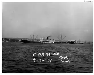 ![]() SS Carmona in September 1941, showing her neutrality markings. | |