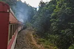Sabah State Railway train passing through the Padas River Valley in 2014.