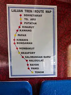 The section Tanjung Aru-Beaufort reopened on 21 February 2011, and the trip now takes 2 hours and 15 minutes as the coaches can run at a speed of up to 80 kilometres/hour compared to 50 kilometres/hour previously. There are a total of 15 stations between Sembulan and Tenom, namely: