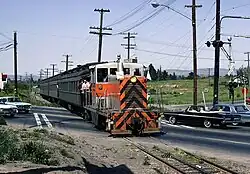 As with most interurban railroads in the US, the SN's return on initial investment was lower and its annual operating costs were higher than had been projected at conception. Interurbans, like most railroads, were very labor-intensive, particularly with the labor costs of maintaining motorized rolling stock and repairing electrical systems.[28] Passenger business was less than initially projected and became increasingly unprofitable, even after SN reached downtown San Francisco via the new San Francisco–Oakland Bay Bridge in 1939. Passenger service south from Sacramento to Pittsburg ended in August 1940,[29] and Chico runs ceased at the end of October.[30] In January 1941, SN operated two weekday trains from Pittsburg to San Francisco and two Concord trains. Interurban passenger service totally ended on July 1, 1941.[31][32] Afterwards, SN transitioned to become a shortline freight-hauling railroad. Its freight business and its relationship with the adjacent Western Pacific Railroad was the lifeblood of the railroad, keeping it in profit long after passenger service had ceased.[4] Although it had a somewhat shorter route from Oakland to Pittsburg/Antioch in competing with the Santa Fe and Southern Pacific steam railroads, its route through the Oakland hills was steep (4%) and curvy by railroad standards plus it had on-street operation in Oakland. Freight trains usually had just a few cars on those grades with locomotives ("juice jacks") at both ends of the train. From Sacramento north to Chico, the SN competed with the Southern Pacific Railroad and, up to 1922, with the Western Pacific from Marysville south. It traversed a low density population rural farm country from Chico which contained only Marysville and Yuba City as major towns before reaching Sacramento. Thus, passenger business north of Sacramento was light and could not be expected to increase. The SN had branches to Vacaville and Dixon, Woodland, Colusa, and Oroville.[33]