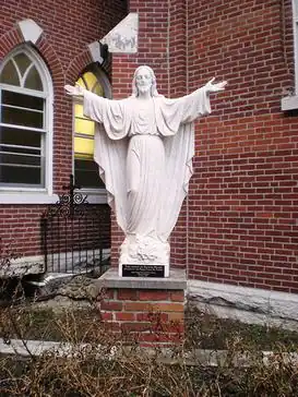 Sacred Heart of Jesus, is a public artwork by an unknown artist, located at Sacred Heart Church, which is in Indianapolis, Indiana, United States of America. It is a marble figure of Jesus standing with his arms outstretched at his sides. He is dressed in robes, barefoot and on his chest is the Sacred Heart. He stands on clouds and thorns, and it is mounted to a base of brick and limestone. Constructed just after 1960, it was on display at Alverna Retreat House in Indianapolis. In 1992 the sculpture was relocated to its current location at Sacred Heart Church.[1]