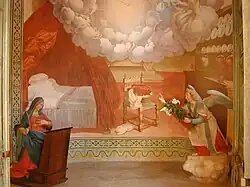 ![]() The Sanctuary atop its crag, as depicted in a fresco in Capella XIV. | |