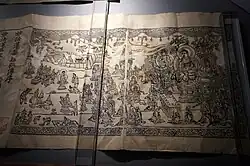 A massive jeweled stupa (a stylized Buddhist reliquary burial mound) rises from the earth and floats in the air.[72] Then a voice is heard from within praising the Lotus Sūtra.[73] The Buddha states that another Buddha resides in the stupa, Prabhūtaratna, who attained awakening through the Lotus Sūtra and made a vow to make an appearance to verify the truth of the Lotus Sūtra whenever it is preached.[74][44]