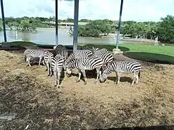 Safari Park is the largest section of the park. It is a 50-minute drive-through through an eight-kilometer park replicating a Savannah habitat. The safari park houses large herds of Asian and African ungulates and a very large free flying waterbirds sanctuary. The main drive-through area houses large herds of herbivores, with up to 100 individuals of a single species. There is a large herd of Masai giraffes with more than 200 individuals. Other animals include a herd of Grant's zebras, Black wildebeest, impalas, white rhinoceroses, Ankole cattle, African buffaloes, gemsbok, hippopotamuses and ostriches. A large number of Asian ungulates are also mixed with African hoofed mammals, such as gaur, nilgai, blackbuck, Sambar deer, Indian hog deer, fallow deer, spotted deer and Dromedary camels. The large waterbirds sanctuary surrounding the park houses a flock of great white pelicans, painted storks, Marabou storks, grey crowned cranes and other bird species. The carnivores have separate drive-throughs separated using gates. They include African lions, Bengal tigers, Asiatic black bears and American black bears, .[2][3]