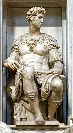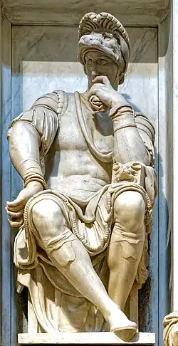 As for the portraits of the dukes, Michelangelo sculpted them seated in two niches above their respective tombs, facing each other, both dressed as Roman leaders. These sculptures, with attention to the smallest details, are idealized and do not reproduce real features, but nonetheless have a strong psychological character (Giuliano sitting in a proud posture with the baton of command is more haughtier and decisive, while Lorenzo, in a thoughtful pose, is more melancholic and meditative). A popular tradition tells that someone criticized the lack of resemblance of the portrait to the true features of Giuliano; Michelangelo, aware that his work would be handed down over time, replied that in ten centuries no one would be able to notice. Giuliano personifies active life, one of the two roads that lead to God. His scepter alludes to royal power, characteristic of those born under the sign of Jupiter. The coins are a symbol of magnanimity and indicate that the active man loves to "expend" himself in action. Lorenzo, known by the name "pensive", represents the contemplative attitude. The shadowed face recalls the facies nigra of Saturn, protector of melancholics. The forefinger on the mouth traces the saturnine motif of silence. The reclining arm is an iconographic tope of the melancholy mood. The closed casket resting on a leg is an allusion to parsimony, a typical quality of saturnine temperaments.[5]