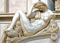 Dawn is a sculpture by Michelangelo, executed for the chapel. It is 6 feet and 8 inches in length. Along with his Night, Michelangelo drew from the ancient Sleeping Ariadne for his sculpture's pose.[8] This was in turn influential on Benvenuto Cellini's Diana of Fontainebleau.[15]