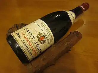 Saint-Joseph or St.-Joseph (French pronunciation: [sɛ̃ ʒozɛf]) is a French wine Appellation d'Origine Contrôlée (AOC) in the northern Rhône wine region of France. Though the appellation covers the largest amount of land, it is second in actual size under vine to Crozes-Hermitage, an appellation with which it shares much regarding style and prestige. St.-Joseph is primarily a red wine region, but also produces a white wine. The red is produced predominantly from the Syrah grape, but AOC regulations allow up to 10% of Marsanne or Roussanne. The white wine is made exclusively from the latter grape varieties.