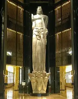 The interior design, in the "Zigzag Moderne" style, was inspired by the Exposition Internationale des Arts Décoratifs et Industriels Modernes, which emphasized soft ornamentation and sensuous curves. In Memorial Hall, the white marble floor contrasts with three-story black marble piers that lead to a gold-leaf ceiling. At the end of the hall stands the 60-ton, 38 feet (11.6 m) white onyx sculpture Indian God of Peace by Carl Milles, later renamed Vision of Peace.[4]