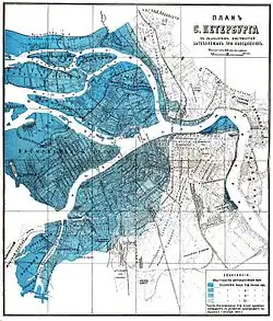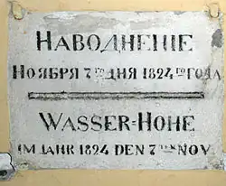 Floods in Saint Petersburg refer to a rise of water on the territory of St. Petersburg, a major city in Russia and its former capital. They are usually caused by the overflow of the delta of Neva River and surging water in the eastern part of Neva Bay but sometimes caused by melting snow. Floods are registered when the water rises above 160 cm with respect to a gauge at the Saint Petersburg Mining Institute. More than 300 floods have occurred since the city was founded in 1703.[1][2][3]