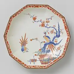 The first pieces were produced in 1643, with Chinese pigments.[3] They are also called ko-Imari, as they were shipped to Europe through the harbour of Imari.[3] Kakiemon ware was extensively exported to Europe by the Dutch, until the Chinese industry was reestablished with the stabilization of the Qing dynasty, and the Dutch then shifted their orders to China, which started to manufacture imitations of the Japanese ware, known as "Chinese Imari".[2]