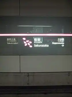 Sakurazuka Station (桜坂駅) is a subway station on the Fukuoka City Subway Nanakuma Line in Chūō-ku, Fukuoka in Japan. Sakurazuka is literally "cherry blossom slope" in Japanese. So its station symbol is a picture of seven cherry blossom petals in pink is fluttering in the wind.