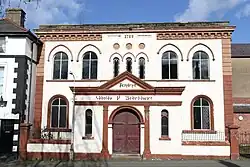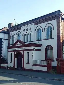 The Pen-y-Bryn Baptist Chapel, opened as the Chapel Street English Congregational Chapel,[2] is located on Chapel Street in Wrexham, North Wales. It was originally built as a Congregational (Independent) English Baptist Chapel in 1789, modified from 1816 to 1818, and was extensively remodelled in 1881, which most of its current appearance dates to.[21][22][23] In 1881, at the time of a religious census, there was a recorded 240 people in attendance at the chapel, while 204 people were recorded in the 1904 religious census. It was built for the English Baptist congregation that broke from the congregation on Chester Street,[2] and who had by then congregated in a house on Chapel Street, although the English Baptists vacated Pen-y-Bryn in 1898 following the construction of the nearby Salisbury Park Congregational Chapel (now the United Reformed Church).[24] It was subsequently bought by a congregation of Welsh Baptists in the late 19th century, with the Welsh Baptists still using Pen-y-Bryn by 2013. Its exterior is stucco over brick, with a hipped slate roof. It is two-storeys and in a sub-Classical style.[2][21][22][23] The chapel gave the adjacent Pen y Bryn street its name.[2]