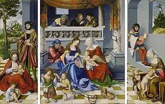 For some centuries, religious art throughout Germany and the Low Countries frequently presented Saint Anne with her husbands, daughters, sons-in-law and grandchildren as a group known as the Holy Kinship. During the Reformation the idea of the three husbands was rejected by Protestants, and by the Council of Trent by Catholic theologians also, but Salome continued to be regarded as probably the sister of the Virgin Mary, and the wife of Zebedee, and mother of the two apostles.[3] The Catholic Encyclopedia of 1913 said (rather more cautiously than leading 19th-century Protestant books of biblical reference) that "some writers conjecture more or less plausibly that she is the sister of the Blessed Virgin mentioned in John 19:25".[5]