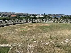 The city quickly acquired Roman characteristics: walls, a forum, a theatre, an amphitheatre which are the most conspicuous above-ground remains today, public baths, and an aqueduct.[8] Many inscriptions in both Latin and Greek have been found both inside the walls and in the cemeteries outside, since Romans forbade burials inside the city boundaries. Several fine marbles sarcophagi from those cemeteries are now in the Archaeological Museum of Split. All this archaeological evidence attests to the city's prosperity and integration into the Roman Empire. Salona had a mint that was connected with the mint in Sirmium and gold and silver mines in the Dinaric Alps through Via Argentaria.[9][10][11][12]