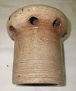 Salt-glaze or salt glaze pottery is pottery, usually stoneware, with a ceramic glaze of glossy, translucent and slightly orange-peel-like texture which was formed by throwing common salt into the kiln during the higher temperature part of the firing process. Sodium from the salt reacts with silica in the clay body to form a glassy coating of sodium silicate. The glaze may be colourless or may be coloured various shades of brown (from iron oxide), blue (from cobalt oxide), or purple (from manganese oxide).[1][2][3]