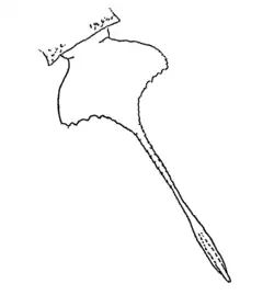 The long stem- or rod-like structure of the telson is ornamented on each side with tubercles (knobs), arranged in pairs, that gradually get flatter. The tri-lobed structure, sometimes dubbed the "post-telson" (though this structure was part of the telson), on the end of the stem is unique to Salteropterus.[4] The central lobe is larger than the other two, extending beyond them and having a ventral position. It is possible that this tri-lobed structure had the function of additional balancing in combination with the large flattened part before it.[1]