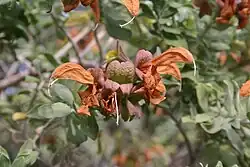 It has numerous woody stems growing to more than 1 m (3.3 ft)in height and width, with sparse grey-green leaves. The flowers start out as a bright yellow, turning into a rusty color, with the dark rusty-colored calyx persisting long after fruiting begins.[2] The flowers are shaped like a parrot's beak and occur in pairs at the ends of branches.[3]