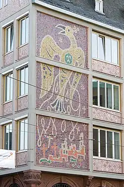 The “Salzhaus” of the post-war period is a modern reinforced concrete building on the preserved ground floor of the previous building. The decoration of the new building, on the other hand, is unusually rich for the time it was built. Below the windows there is limestone cladding, the eastern side is occupied by a glass mosaic spanning the three full storeys by the artist Wilhelm Geißler. It is intended to symbolise the mood of development and departure after the war and shows the motif of the phoenix from the ashes.