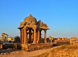 In Sikhism, the term "samadhi" is used for the mausoleums of eminent figures, both religious and political. Examples include the Samadhi of Ranjit Singh in Lahore, and that of Maharaja Sher Singh near Lahore. Hindu equivalents are usually called chatri, although those for Maratha Empire figures also often use "samadhi". The forms of structure called "samadhi" vary greatly. The word is sometimes used for a memorial stele, also called paliya, a type of hero stone once common in parts of Gujarat and Sindh. It may be used for small memorial buildings such as open chatri, often placed around a temple. In Punjab, samadhis are also known as marhī.[5]
