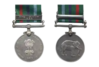 The Samanya Seva Medal 1965 (General Service Medal 1965) is a military service medal of the Indian Armed Forces. Established 8 May 1975, with retroactive effect to 26 January 1965, the Samanya Seva Medal is awarded for active service where no other campaign medal is awarded. Clasps are awarded with the medal designating recognized operations.[3]