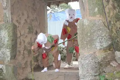 In the Samgong-maji ceremony, one shaman summarizes the Samgong bon-puri narrative while two other shamans enter with walking sticks, dressed as beggars and reenacting the blindness of Gameunjang-agi's parents. When wine is offered to these two shamans, they open their eyes, as the parents do in the myth. The shaman dressed as the father then begins beating his surroundings, including the assembled worshippers, with his walking stick while repeating refrains such as "O sarok, o sarok!" and "Let us cast out blue sarok, black sarok, blindness-causing sarok."[20] The shaman dressed as the mother then ties a woven reed seat to her front and asks the worshippers for offerings, while the other shaman beats her with his stick. The two shamans alternate between beating the other and being beaten until eventually, the seat is thrown out of the front gate of the house. The shamans thus accomplish the ritual expulsion of inauspicious jeonsang.[21]