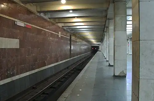 Samgori (Georgian: სამგორი) is a station of the Tbilisi Metro on the Akhmeteli–Varketili Line (First Line) situated between Isani and Varketili stations. It serves the district and the neighbourhood it is named after. Next to the station is the Tbilisi junction station of the same name of Samgori (alternatively called Navtlughi). The Samgori metro station has two main entrances, the one from Moscow ave and the one from Kakheti highway, connected with a tunnel that until the 90s had a travelator.[1] The station walls are decorated with relief images.[2] The station was opened on 5 May 1971 as an extension of the Didube–300 Aragveli line.