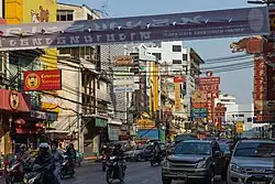 ![]() Aerial view of Odeon Circle and Chinese Gate, while Wat Traimit in the back is located in Talat Noi. | |