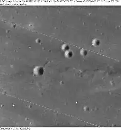 Lunar Orbiter 4 image showing Sampson left of center with four other small, unnamed craters of similar size.