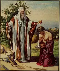 Samuel (Hebrew: שְׁמוּאֵל Šəmūʾēl, Tiberian: Šămūʾēl)[1] is a male name and a surname of Hebrew origin. It means "name of God", deriving from the Hebrew Shem (שֵׁם) (which means "name")[2] + ʾĒl (which means "God" or "deity").[3] However, from the explanation given in 1 Samuel 1:20, the name could alternatively come from a contraction of the Hebrew שְׁאִלְתִּיו מֵאֵל (Modern: Šəʾīltīv mēʾĒl, Tiberian: Šĭʾīltīw mēʾĒl), meaning "I have asked/borrowed him from God".[4][5] This is the verse in which the Prophet Samuel's mother Hannah names her son, after praying that she would be able to give birth. Her prayers having been answered, she dedicates the child to God as a Nazirite. Samuel was the last of the ruling judges in the Old Testament. He anointed Saul to be the first King of Israel and later anointed David.