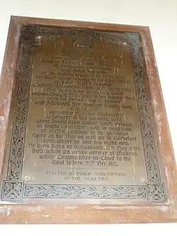 Hood was about to retire and return to England. Rear-Admiral Sir George Burlton had been appointed to succeed him, but before the exchange could take place Hood died at Madras on 24 December 1814 after a three-day fever following a visit to Tippoo Sahib's former palace at Srirangapatna.[13] "In him it may truly be said, that the British nation lost one of its most experienced and gallant defenders, a long-tried friend and companion of the Immortal Nelson."[20] He was buried at St. Mary's Church, Madras, where survives his mural monument. The heir to his baronetcy, under special remainder, was his nephew Sir Alexander Hood, 2nd Baronet (1793–1851), son of his elder brother Captain Alexander Hood (1758–1798) by his wife Elizabeth Periam, daughter and sole heiress of John Periam (1714–1788) of Wootton House[21][22][23] (alias "Butleigh Wootton") in the parish of Butleigh, Somerset.
