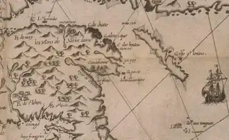 ![]() Detail from "Défaite des Iroquois au Lac de Champlain", Champlain Voyages (1613). This self-portrait is the only surviving contemporary likeness of the explorer.[1] | |