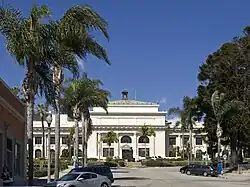 The large Ventura Oil Field was first drilled in 1919 and at its peak produced 90,000 barrels per day (14,000 m3/d).[31][32] The development of the oil fields in the 1920s, along with the building of better roads to Los Angeles and the affordability of automobiles, enabled a major real estate boom. Symphony concerts and Little League teams were sponsored by the oil companies.[33] Contemporary downtown Ventura is defined by extant buildings from this period.[34][35] Landmarks built during the oil boom include Ventura Theatre (1928), the First Baptist Church of Ventura (1926), the Ventura Hotel (1926), and the Mission Theatre (1928).[36][34]