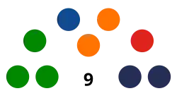 Like the mayor and vice mayors, members of the Municipal Council (called regidores) are elected every four years. San Carlos' Municipal Council has 9 seats for regidores and their substitutes, who can participate in meetings but not vote unless the owning regidor (regidor propietario) is absent.[5] The current president of the Municipal Council is the Social Christian Unity Party member, Raquel Tatiana Marín Cerdas.[8] The Municipal Council's composition for the 2024–2028 period is as follows: